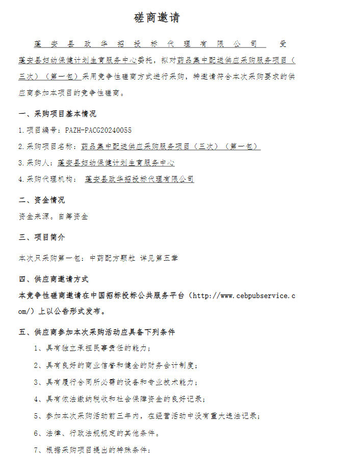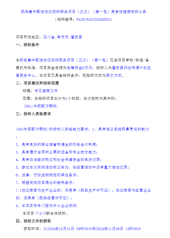 【南充市蓬安县妇幼保健计划生育服务中心】四川省南充市蓬安县妇幼保健计划生育服务中心药品集中配送供应采购服务项目(三次)(第一包)竞争性磋商采购公告