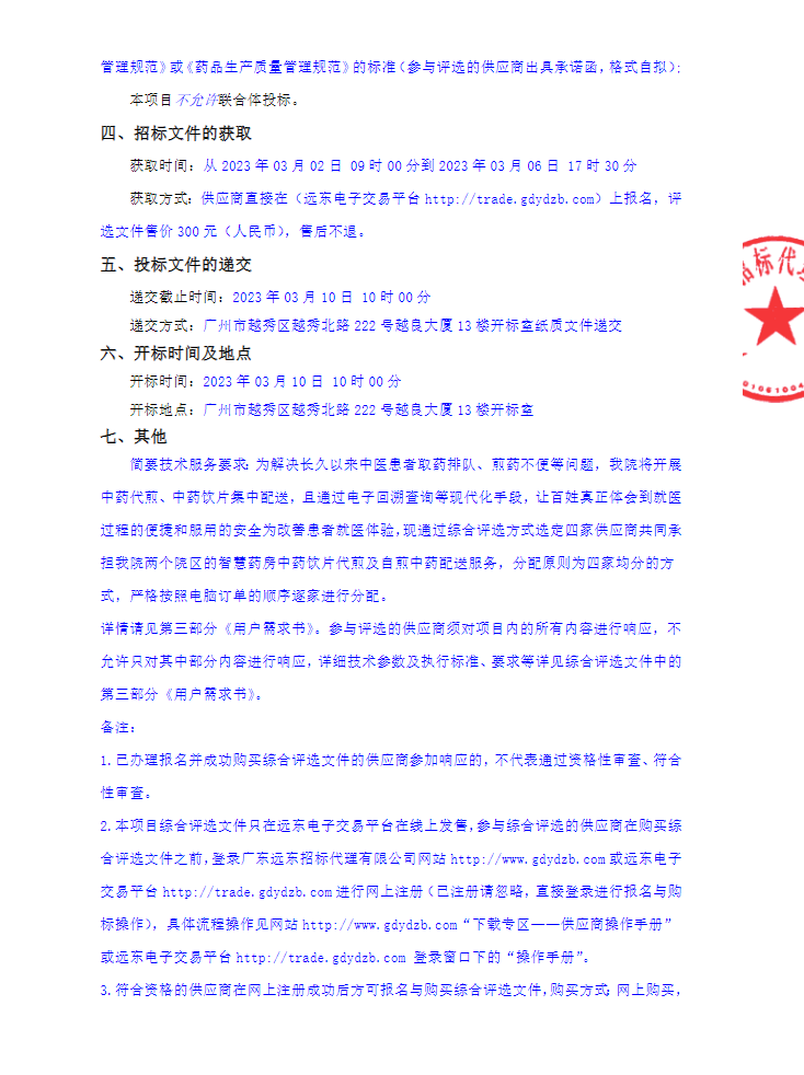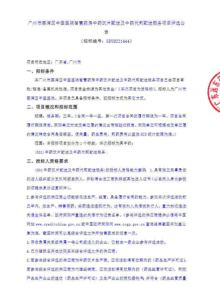 【广州市荔湾区中医医院】广东省广州市荔湾区中医医院智慧药房中药饮片配送及中药代煎配送服务项目评选公告