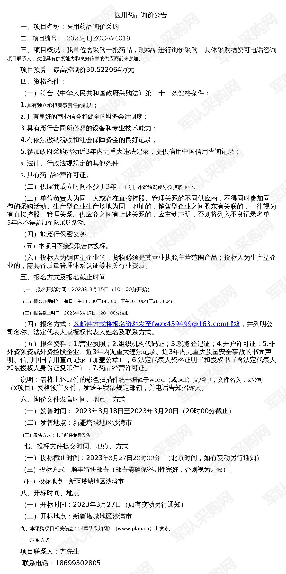 【军队采购】军队采购网医用药品询价公告(2023-JLJZCC-W4019)