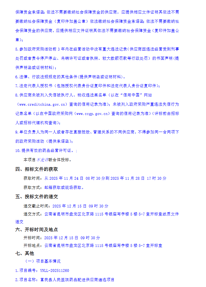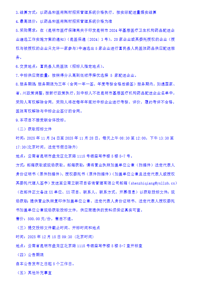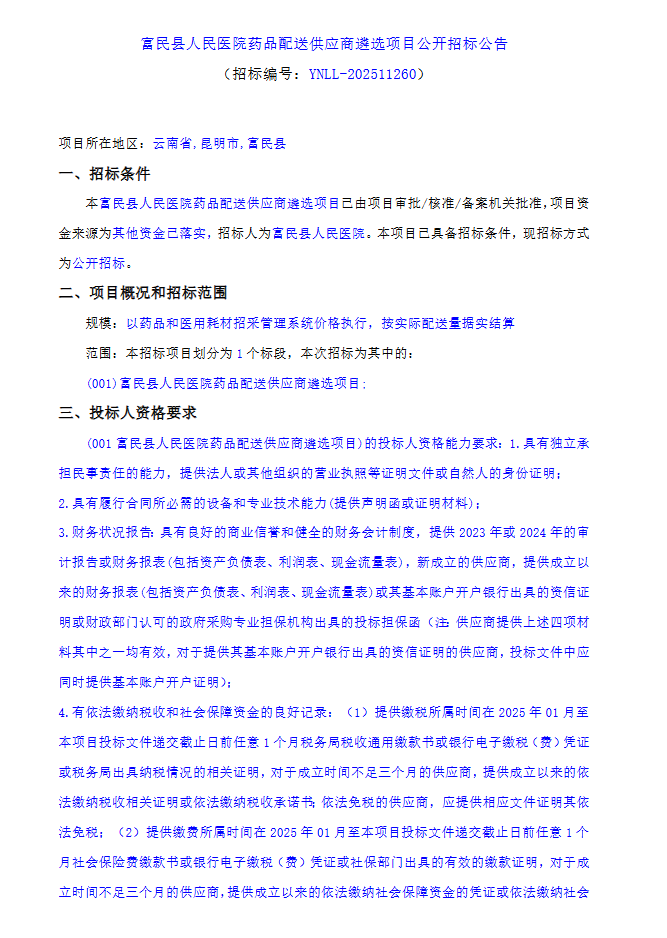 【昆明市富民县人民医院】云南省昆明市富民县人民医院药品配送供应商遴选项目公开招标公告
