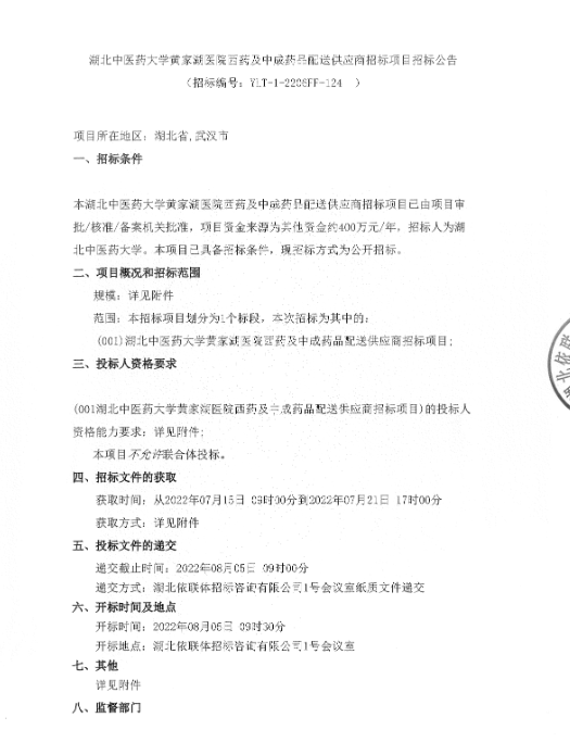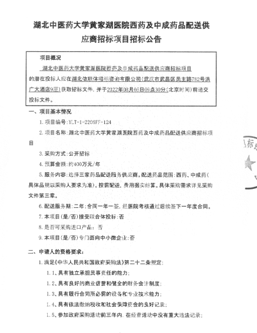 【湖北中医药大学】湖北中医药大学黄家湖医院西药及中成药品配送供应商招标招标公告