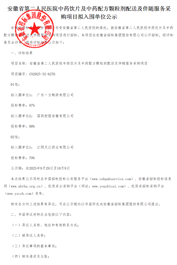 【安徽省第二人民医院】安徽省第二人民医院中药饮片及中药配方颗粒剂配送及伴随服务采购项目拟入围单位公示