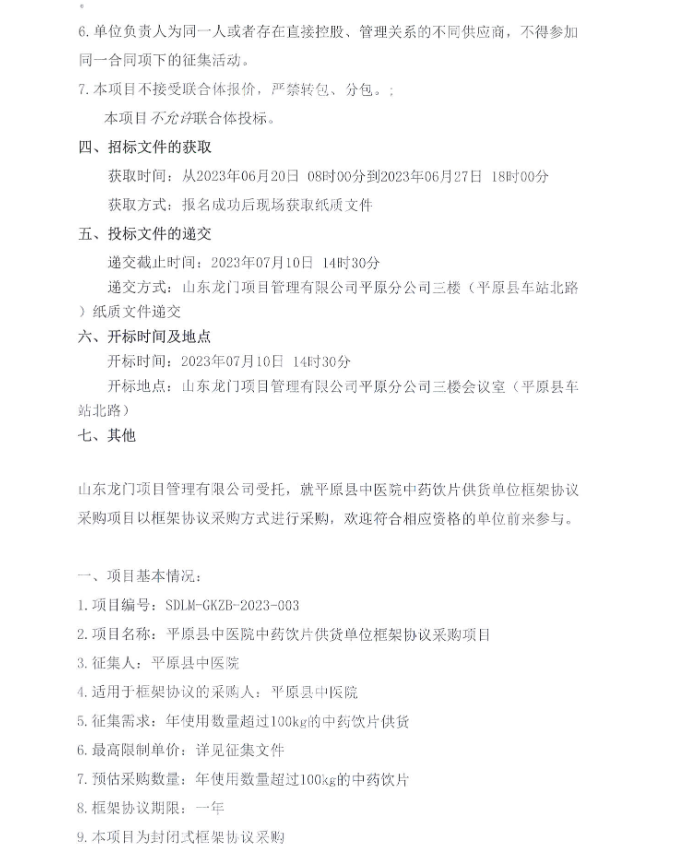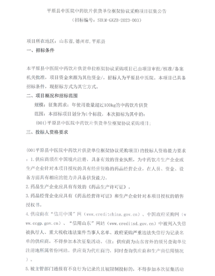 【德州市平原县中医院】山东省德州市平原县中医院中药饮片供货单位框架协议采购项目征集公告