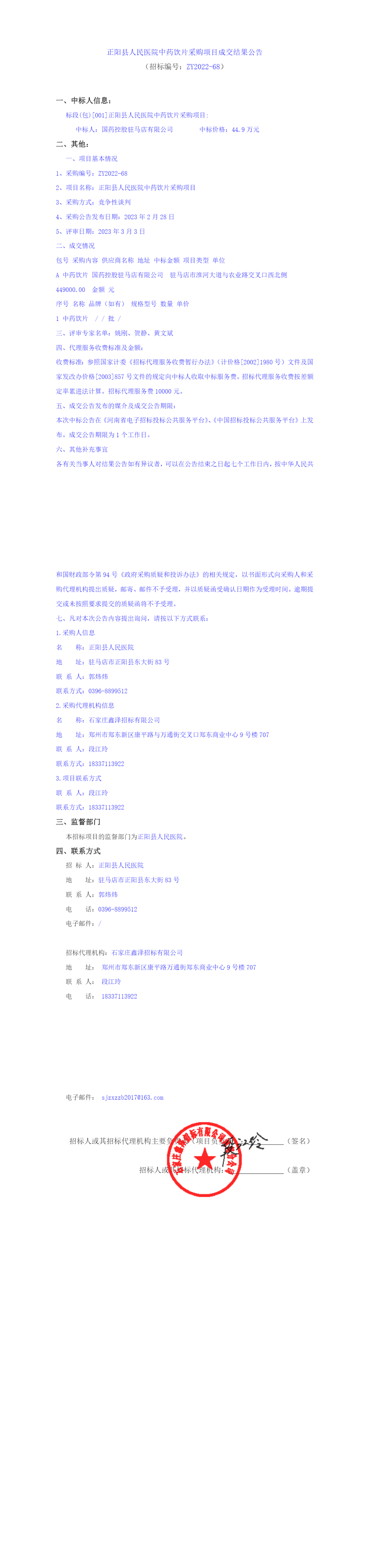 【驻马店市正阳县人民医院】河南省驻马店市正阳县人民医院中药饮片采购项目成交结果公告