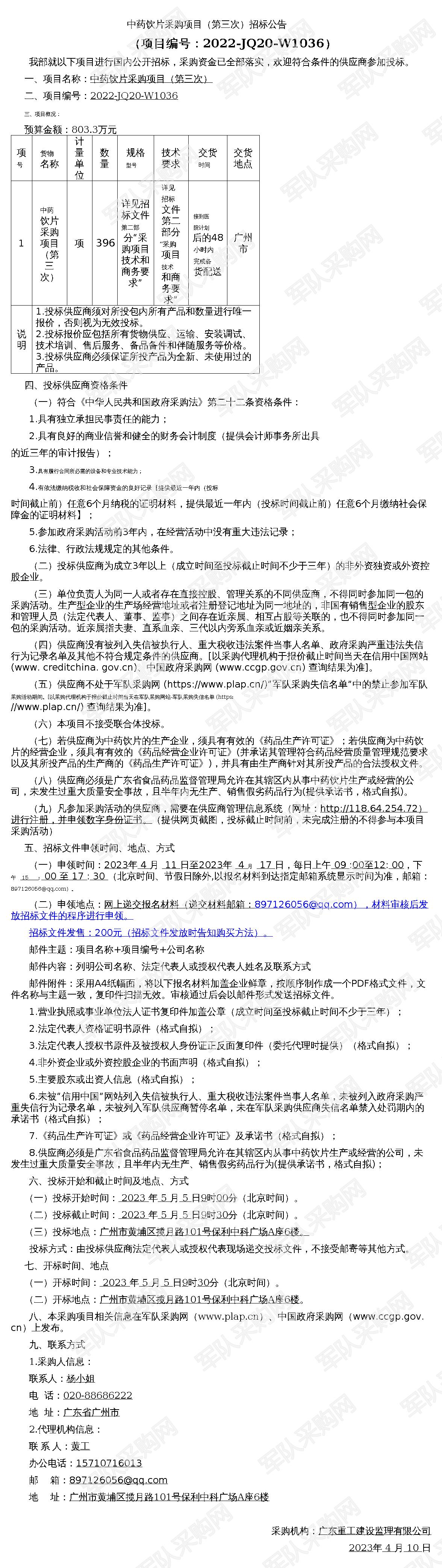 【军队采购】军队采购网中药饮片采购项目(第三次)招标公告(项目编号:2022-JQ20-W1036)