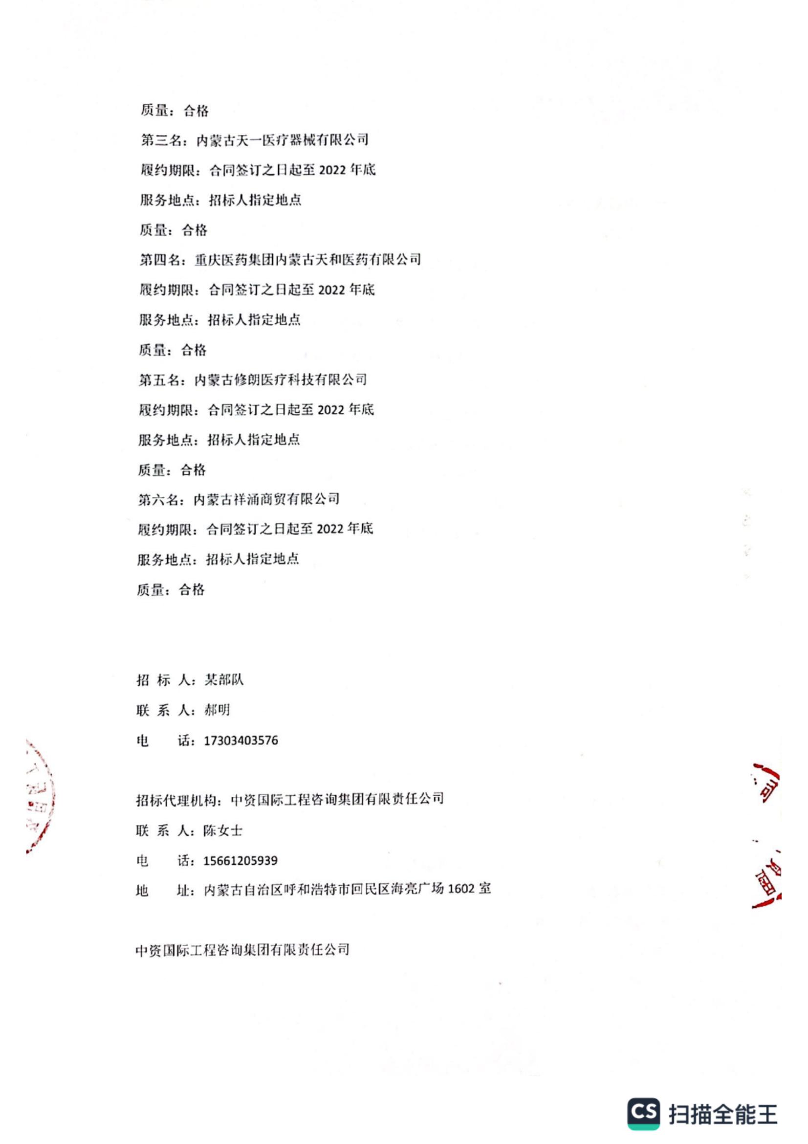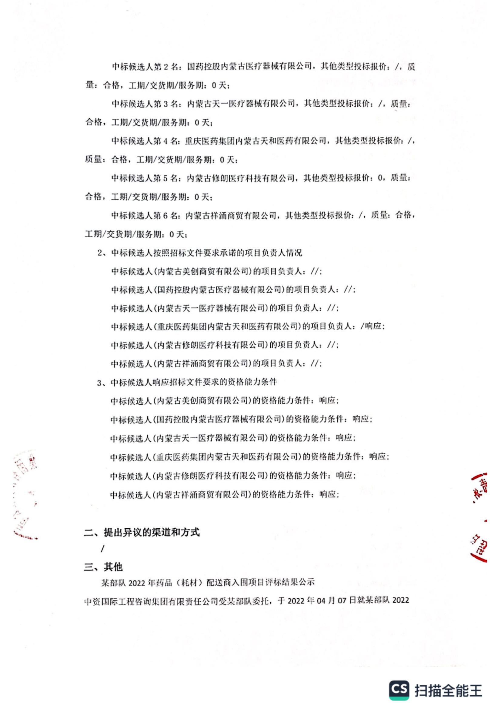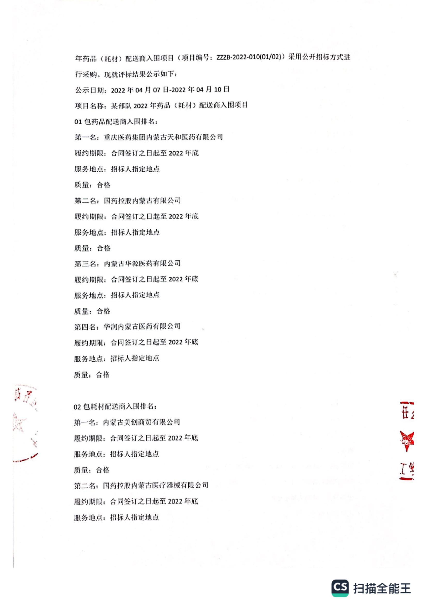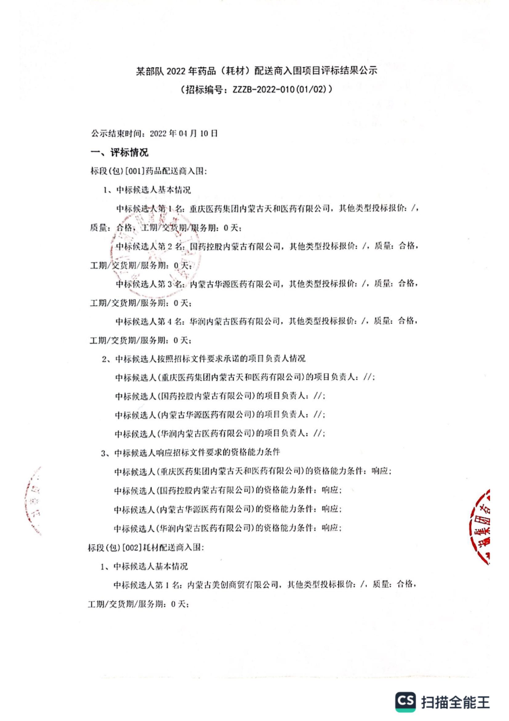 【某部队】某部队2022年药品(耗材)配送商入围项目评标结果公示