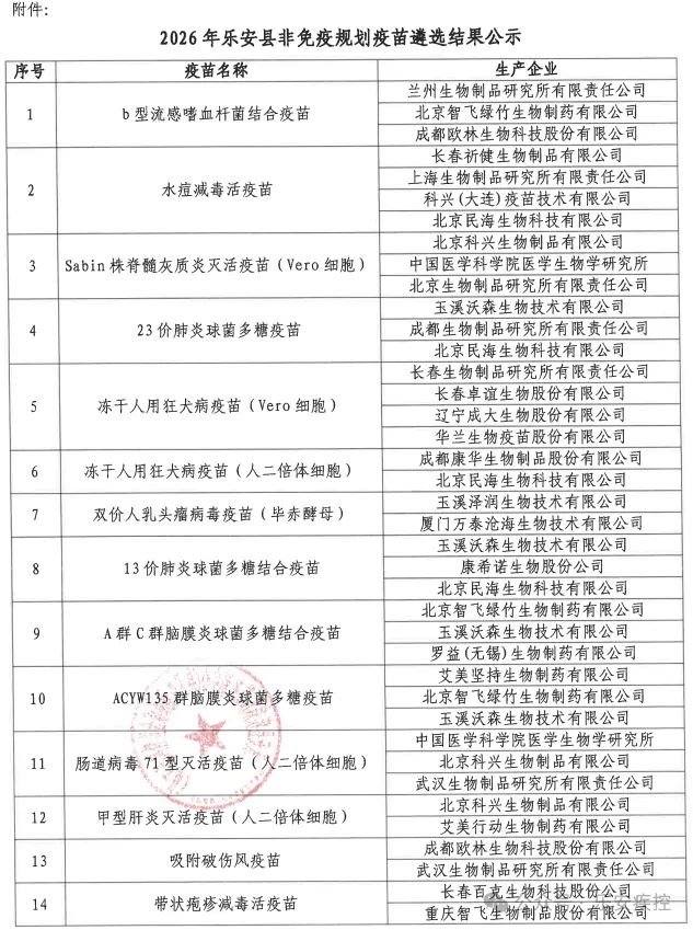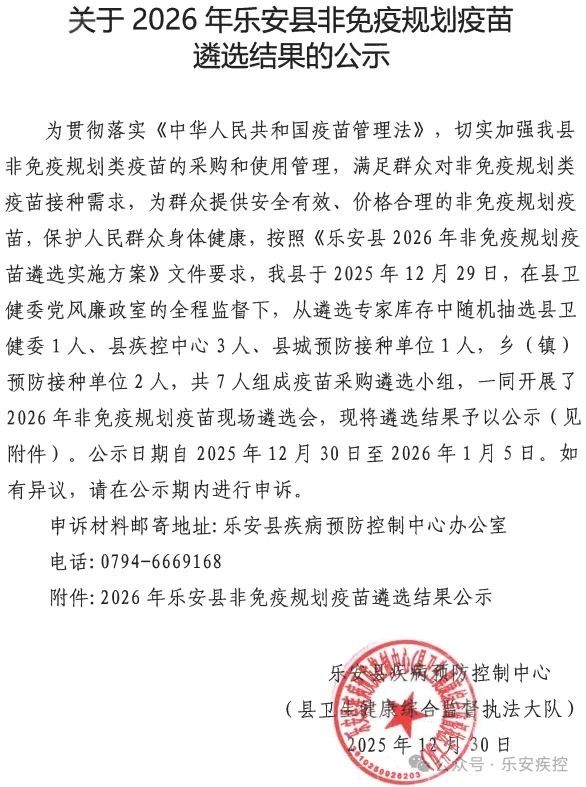 【抚州】关于2026年乐安县非免疫规划疫苗遴选结果的公示