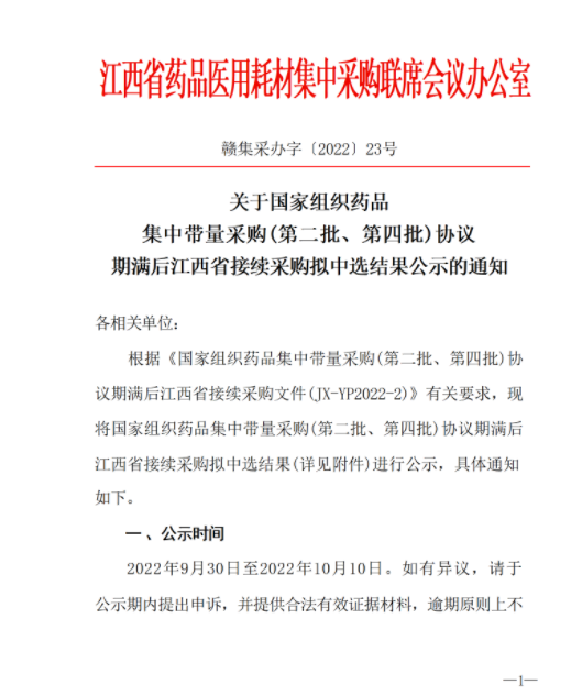 【江西】关于国家组织药品集中带量采购(第二批、第四批)协议期满后江西省接续采购拟中选结果公示的通知