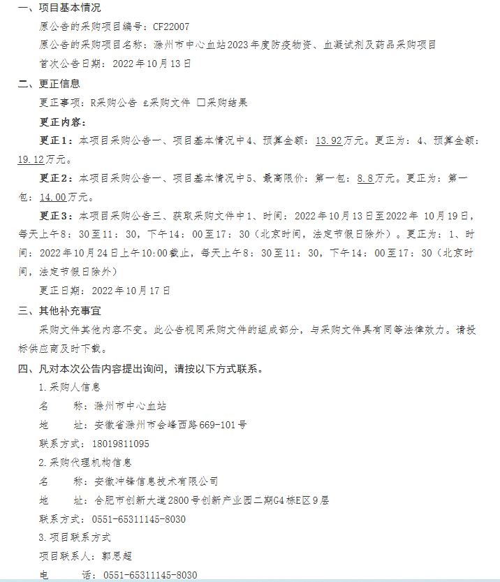 【安徽省滁州市中心血站】2023年度防疫物资、血凝试剂及药品采购项目更正公告(二次)
