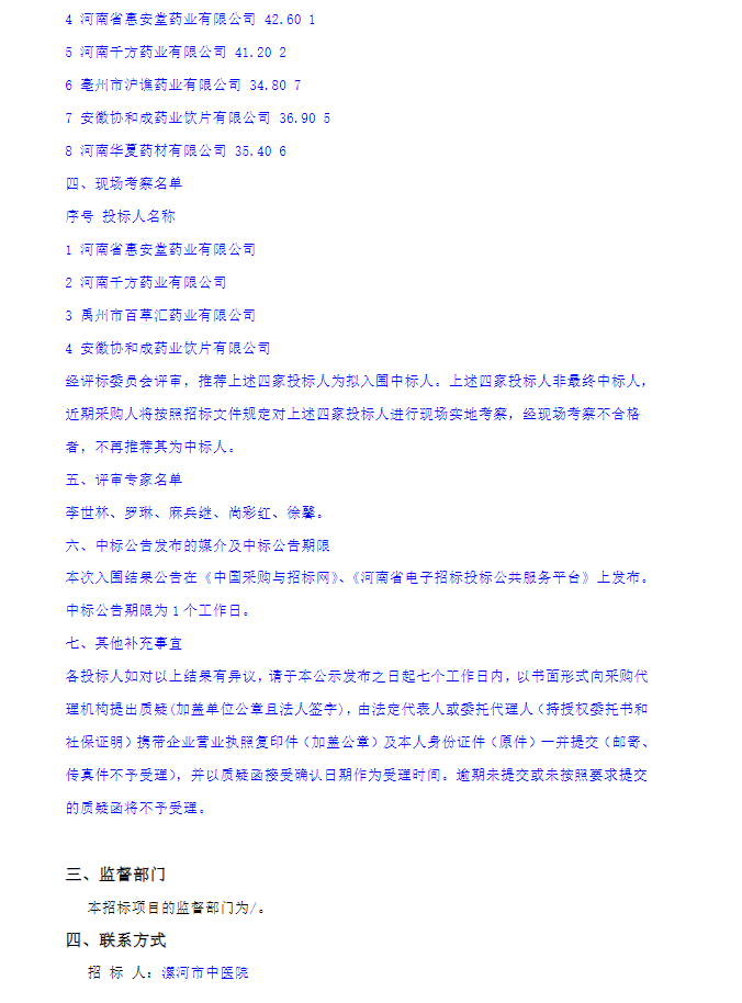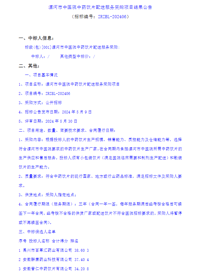 【漯河市中医院】河南省漯河市中医院中药饮片配送服务采购项目结果公告