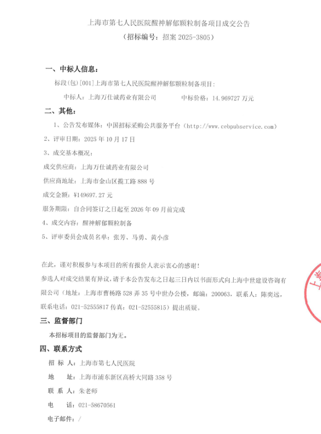 【上海市第七人民医院】上海市第七人民医院醒神解郁颗粒制备项目成交公告