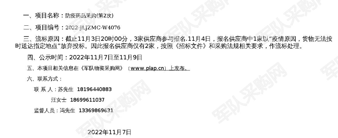 【军队采购】军队采购网防疫药品采购(第2次)流标公示(2022-JLJZMC-W4076)