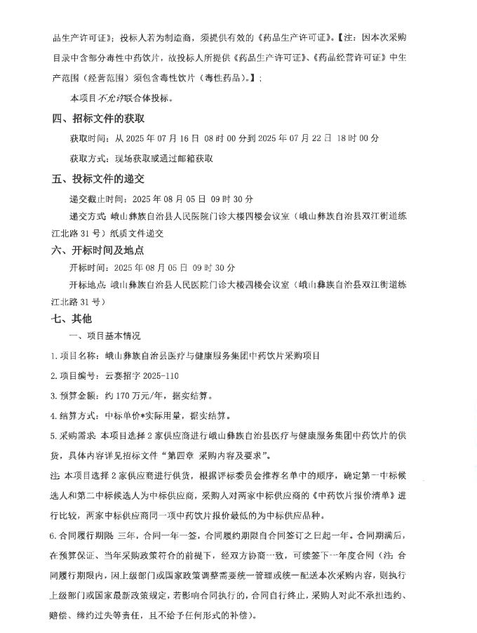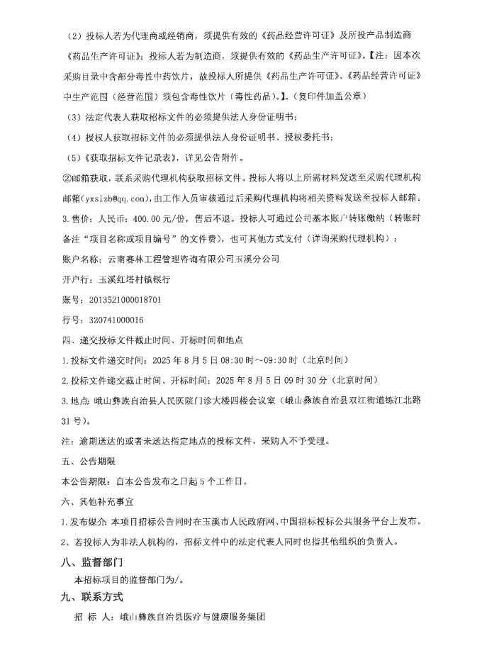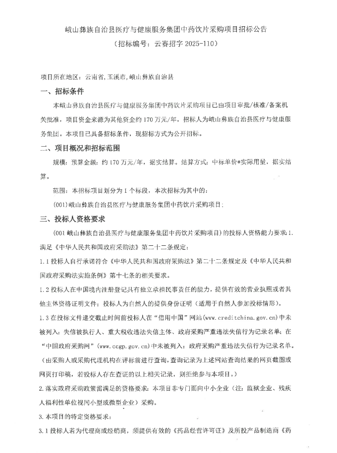 【玉溪市峨山彝族自治县医疗与健康服务集团】云南省玉溪市峨山彝族自治县医疗与健康服务集团中药饮片采购项目招标公告
