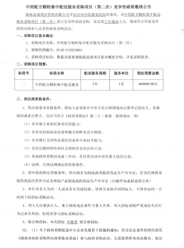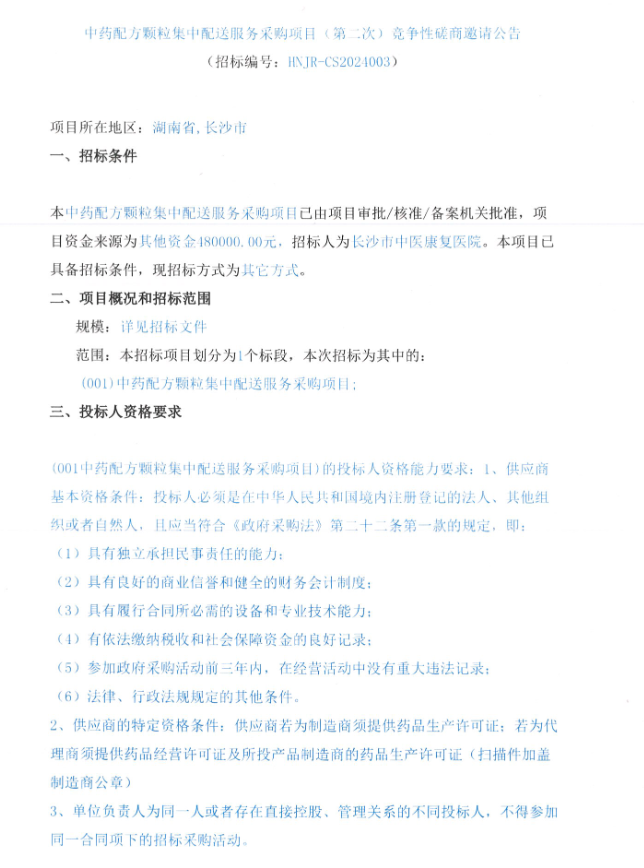【长沙市中医康复医院】湖南省长沙市中医康复医院中药配方颗粒集中配送服务采购项目(第二次)竞争性磋商邀请公告