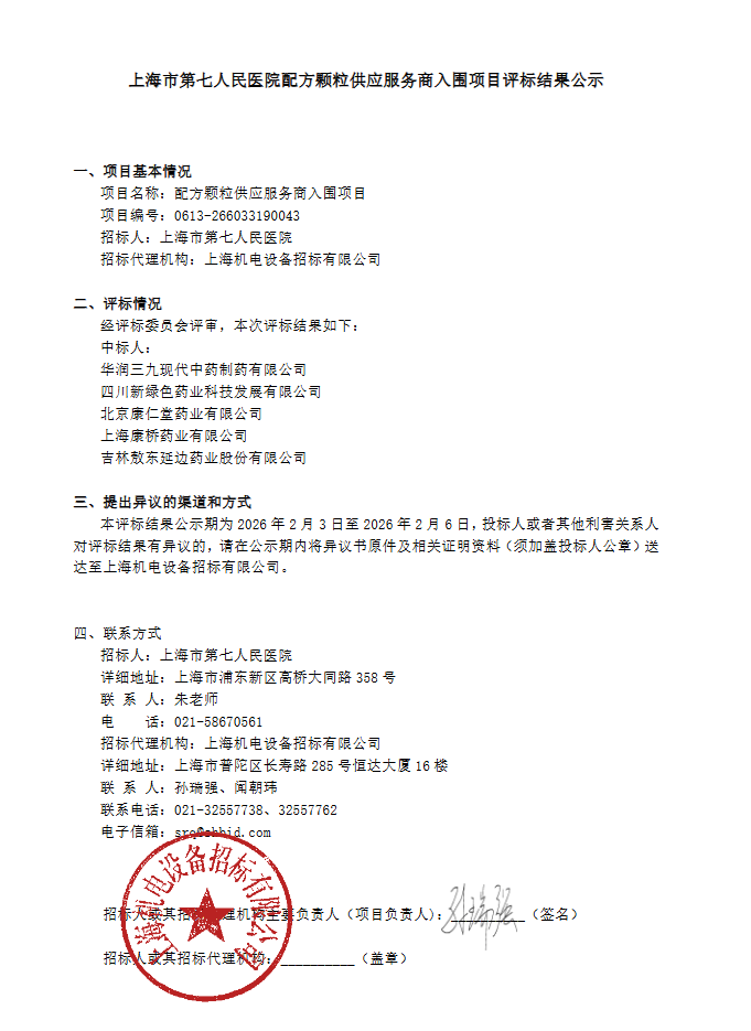 【上海市第七人民医院】上海市第七人民医院配方颗粒供应服务商入围项目评标结果公示