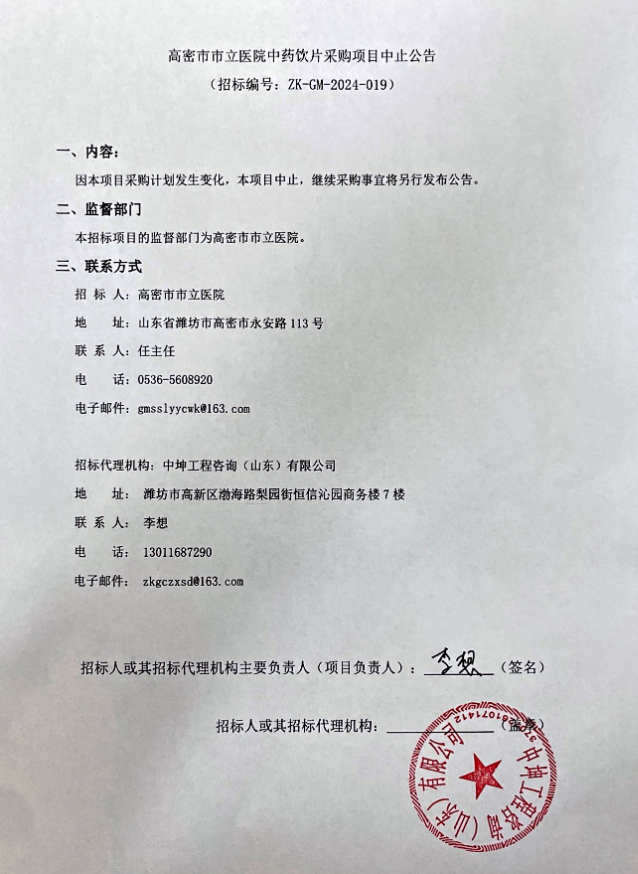 【潍坊市高密市市立医院】山东省潍坊市高密市市立医院中药饮片采购项目中止公告
