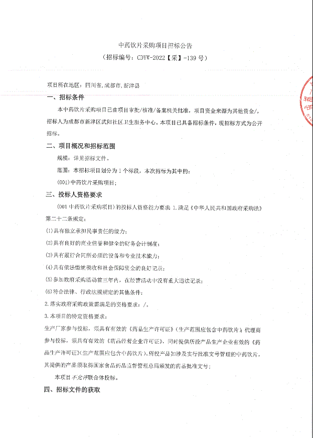 【新津县武阳社区服务中心】新津县武阳社区服务中心中药饮片采购项目招标公告