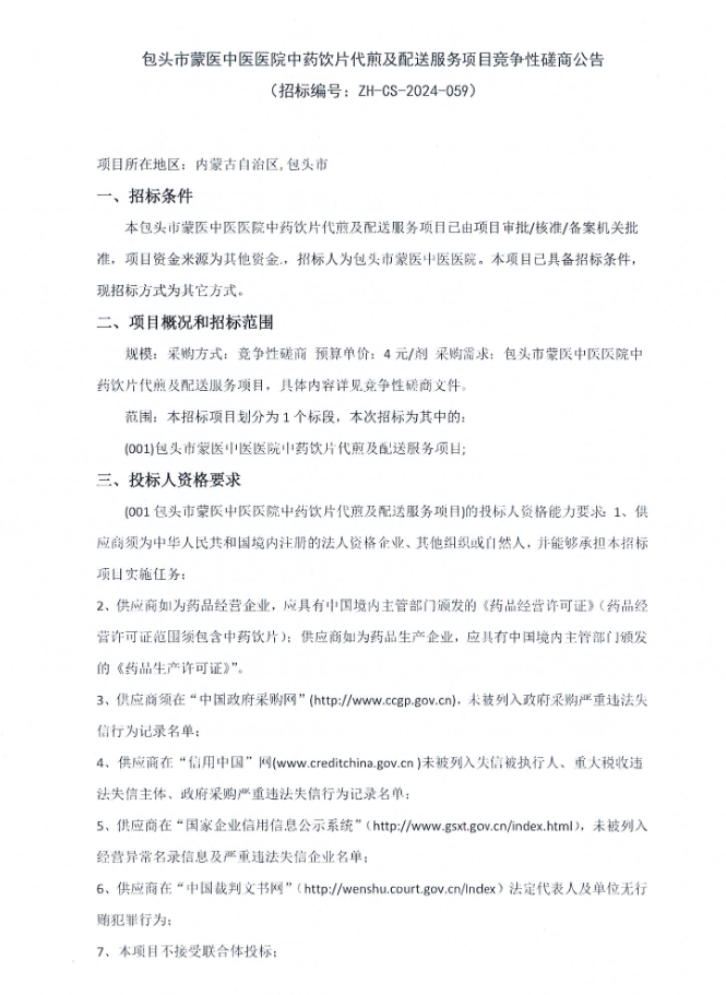 【包头市蒙医中医医院】内蒙古自治区包头市蒙医中医医院中药饮片代煎及配送服务项目竞争性磋商公告