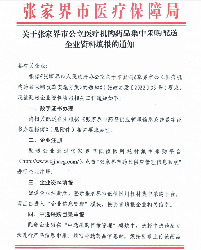 根据《张家界市人民政府办公室关于印发<张家界市公立医疗机构药品采购改革实施方案>的通知》(张政办发〔2022〕33号)要求,现就配送企业资料填报相关工作通知如下: