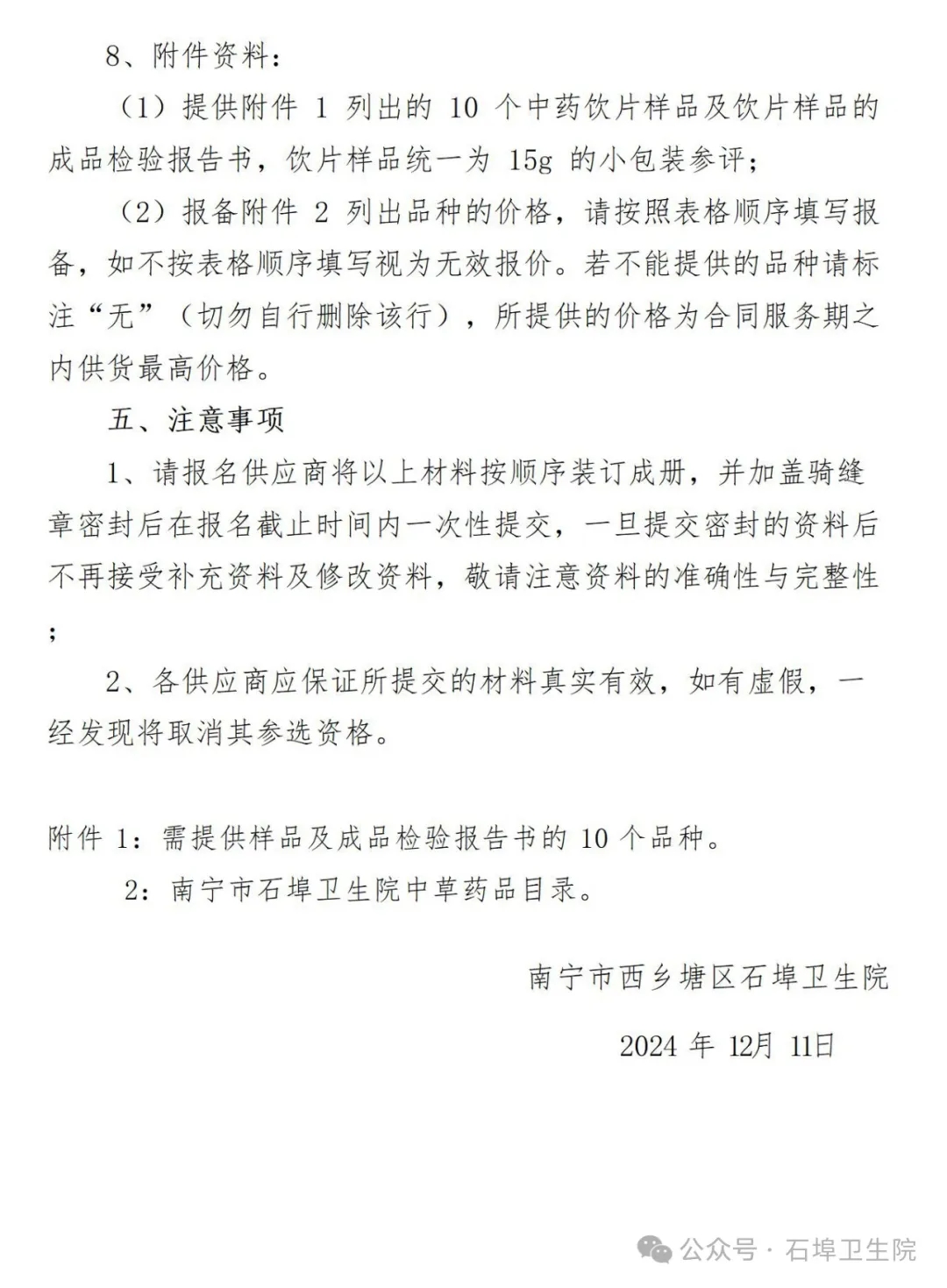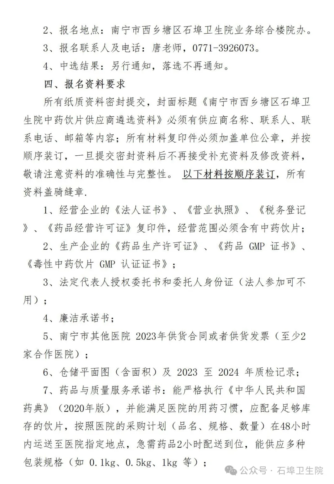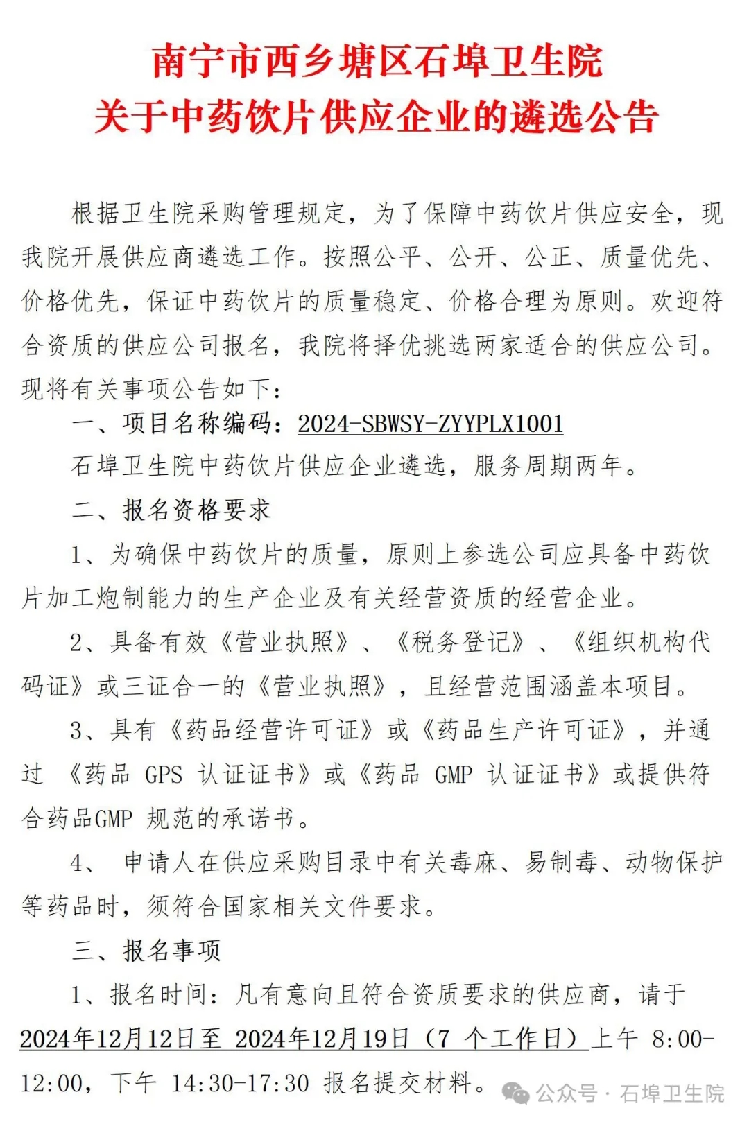 【南宁市西乡塘区石埠卫生院】广西壮族自治区南宁市西乡塘区石埠卫生院关于中药饮片供应企业的遴选公告(20241212)