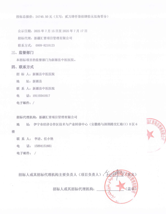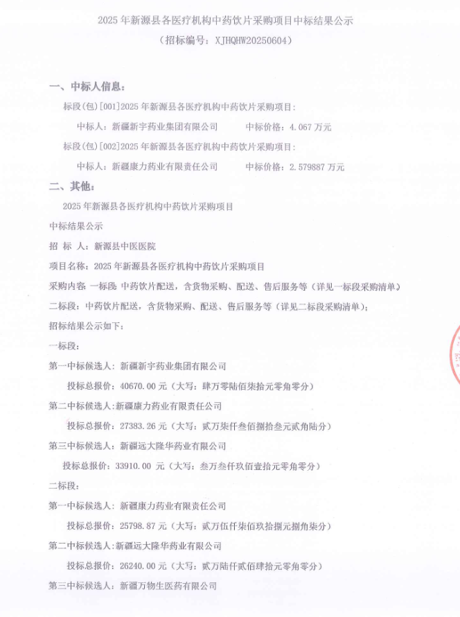 【伊犁哈萨克自治州新源县中医医院】新疆维吾尔自治区2025年新源县各医疗机构中药饮片采购项目中标结果公示