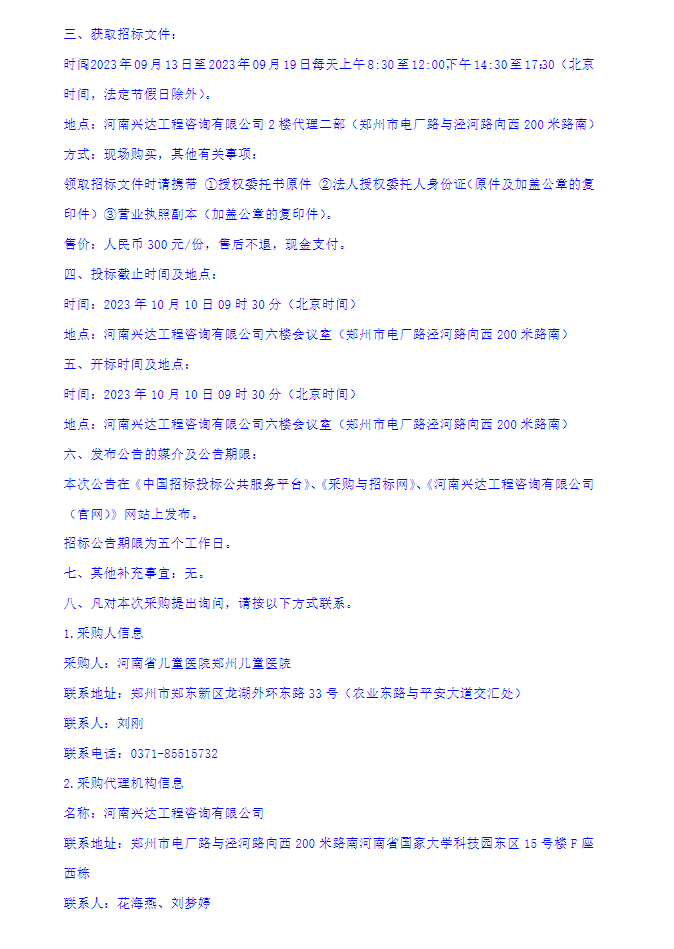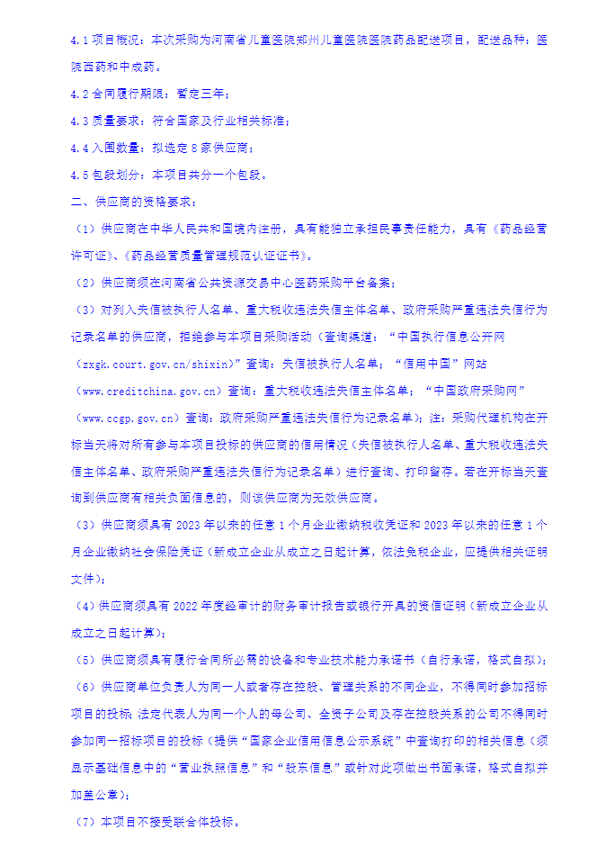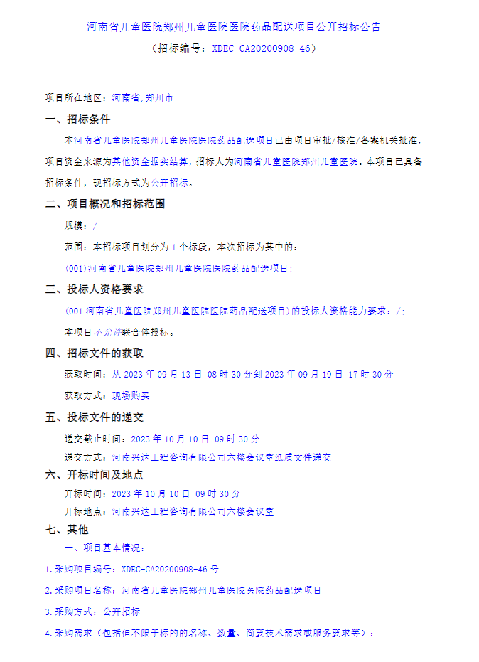 【郑州儿童医院】河南省儿童医院郑州儿童医院医院药品配送项目公开招标公告