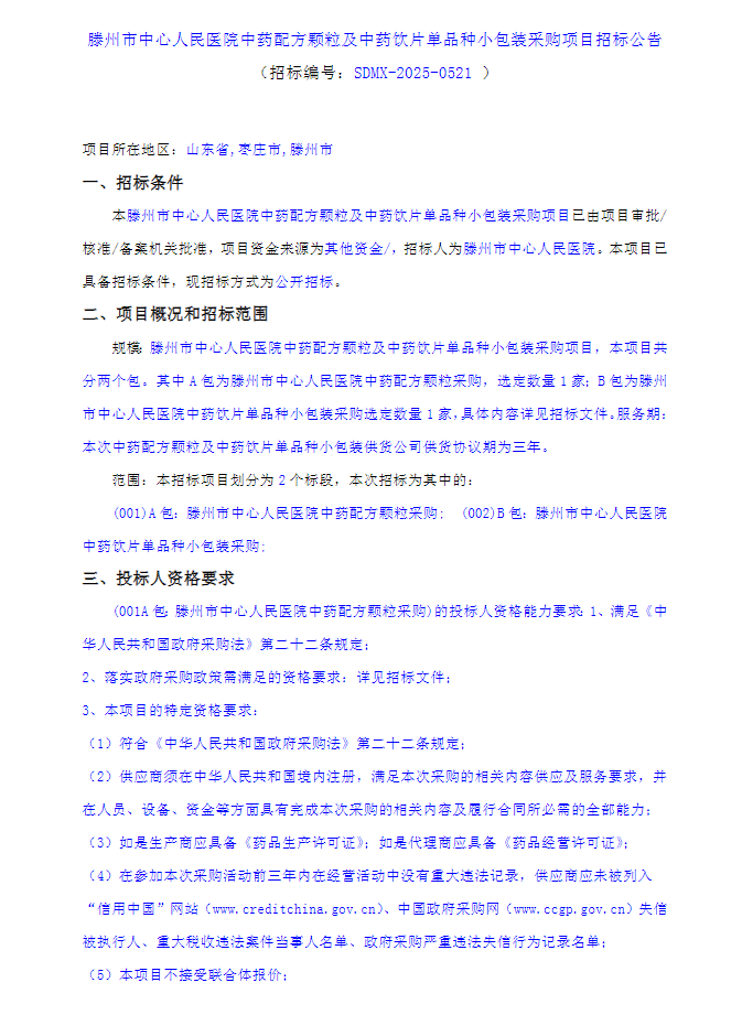 【滕州市中心人民医院】山东省滕州市中心人民医院中药配方颗粒及中药饮片单品种小包装采购项目招标公告