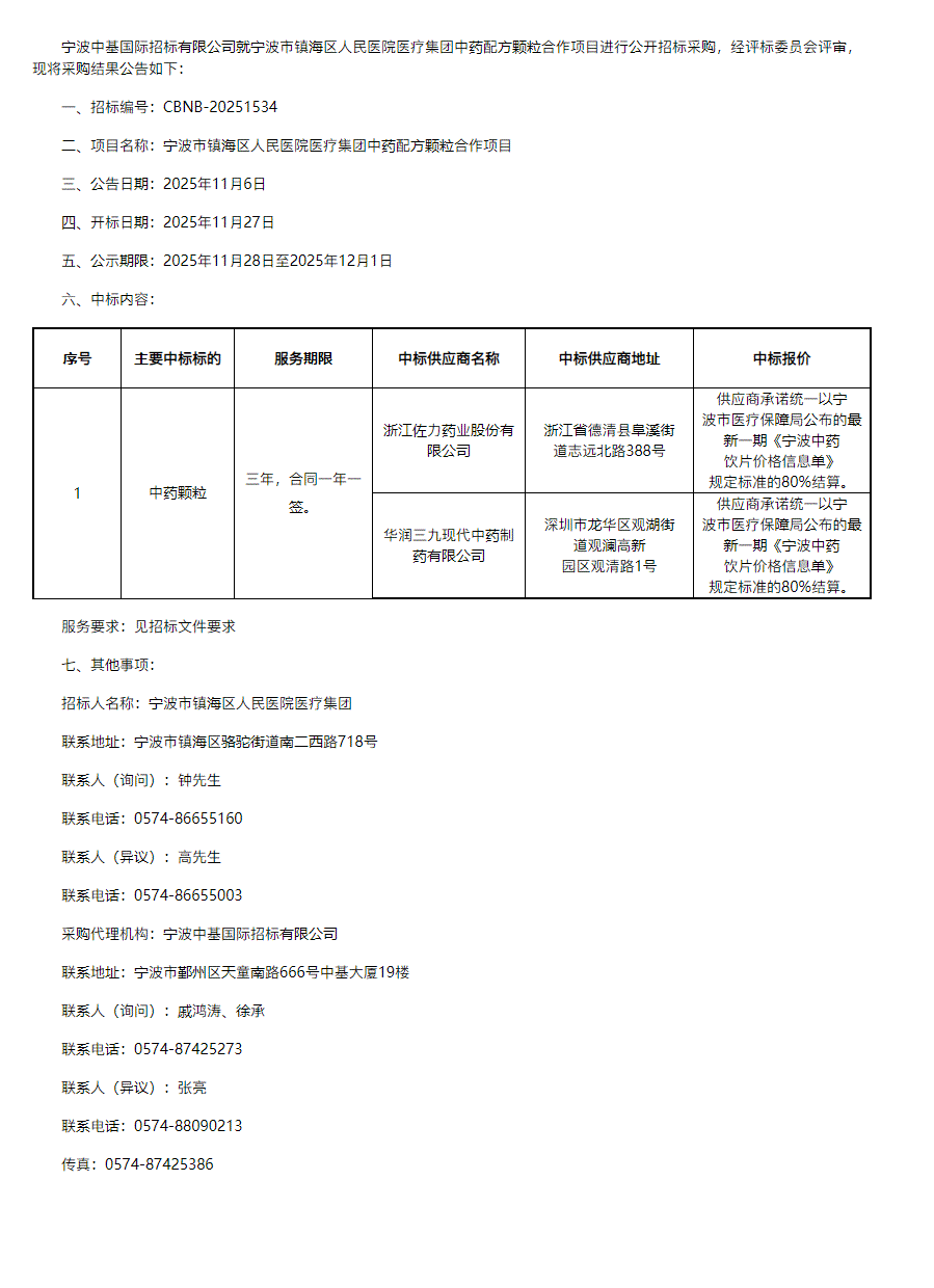【宁波市镇海区人民医院】浙江省宁波市镇海区人民医院医疗集团中药配方颗粒合作项目采购结果公示