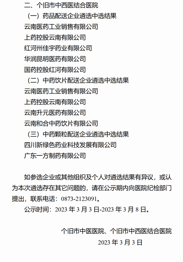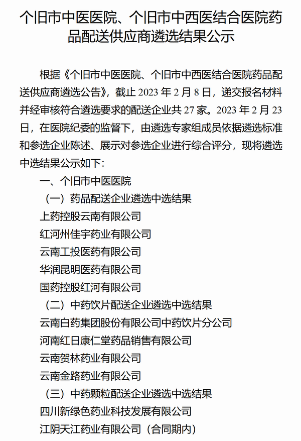 【个旧市中医医院】云南省红河哈尼族彝族自治州个旧市中医医院、个旧市中西医结合医院药品配送供应商遴选结果公示