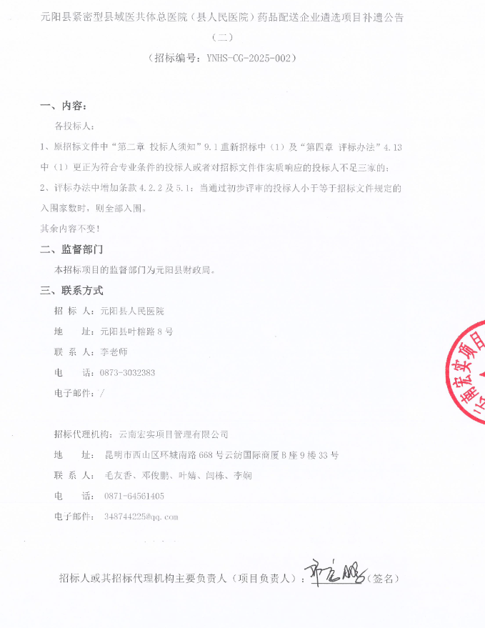 【红河哈尼族彝族自治州元阳县人民医院】云南省红河哈尼族彝族自治州元阳县紧密型县域医共体总医院(县人民医院)药品配送企业遴选项目补遗公告(二)