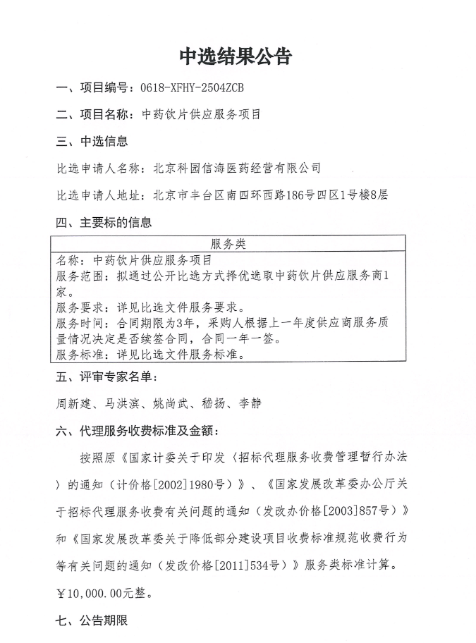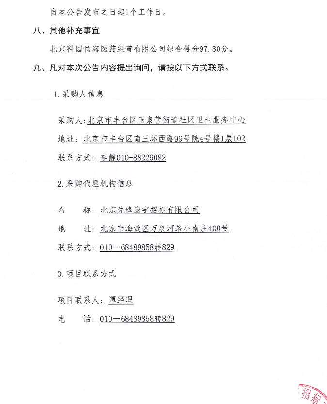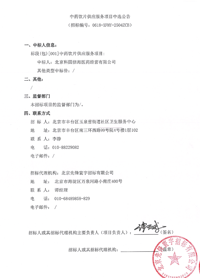 【北京市丰台区玉泉营街道社区卫生服务中心】北京市丰台区玉泉营街道社区卫生服务中心中药饮片供应服务项目中选公告