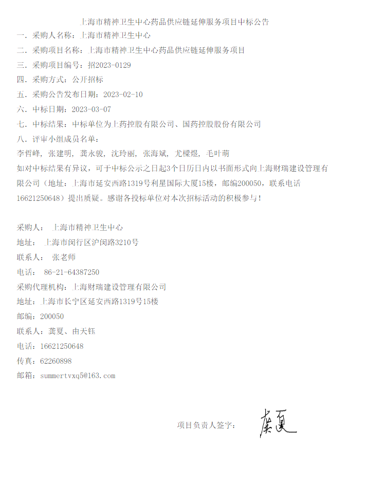 【上海市精神卫生中心】上海市精神卫生中心药品供应链延伸服务项目中标公告