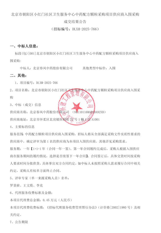 【北京市朝阳区小红门社区卫生服务中心】北京市朝阳区小红门社区卫生服务中心中药配方颗粒采购项目供应商入围采购成交结果公告