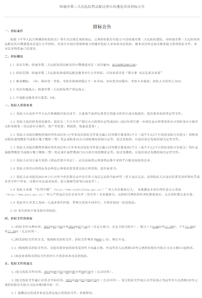 【昭通市第三人民医院】云南省昭通市第三人民医院药品配送供应商遴选项目招标公告