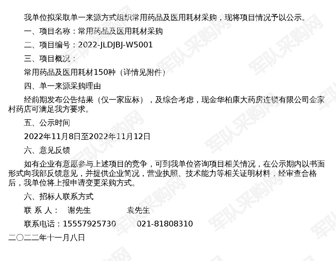 【军队采购】军队采购网常用药品及医用耗材单一来源采购公告(2022-JLDJBJ-W5001)