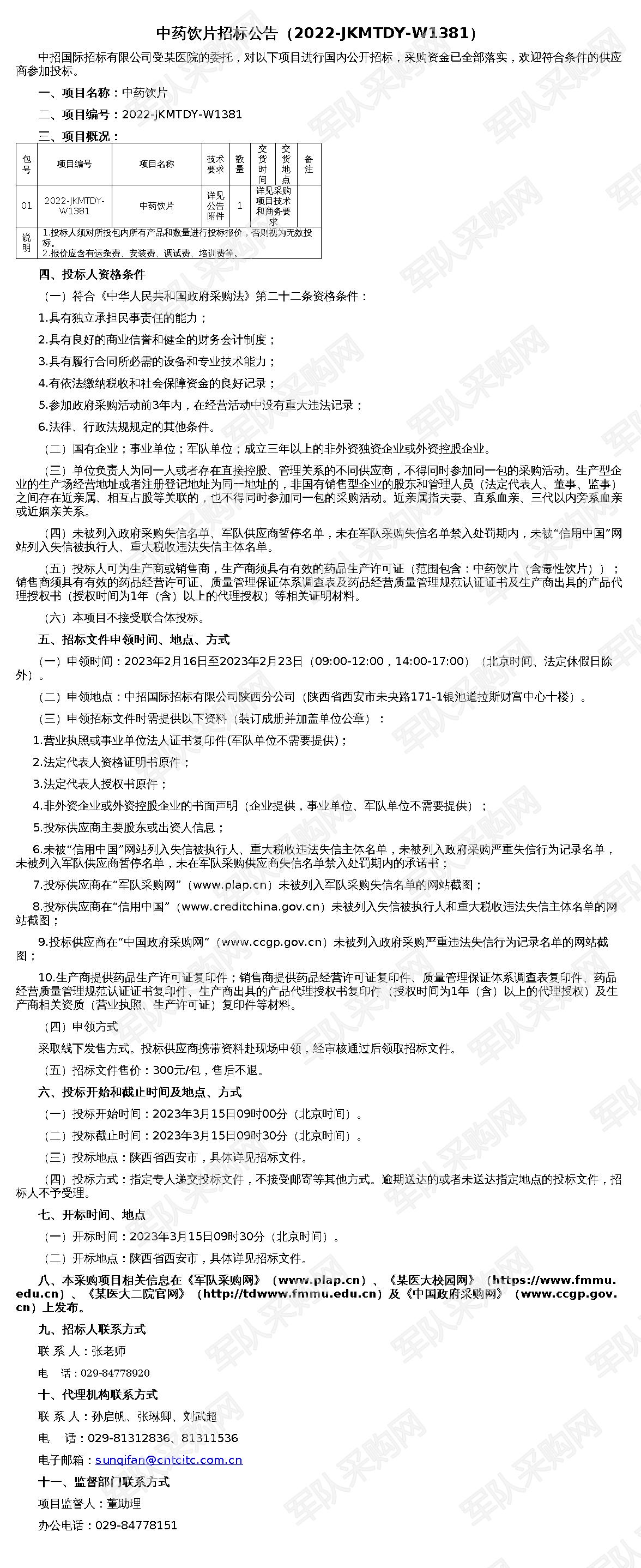 【军队采购】军队采购网中药饮片招标公告(2022-JKMTDY-W1381)(20230216)