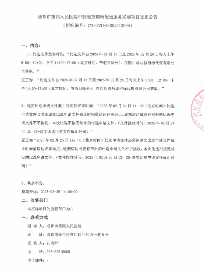 【成都市第四人民医院】四川省成都市第四人民医院中药配方颗粒配送服务采购项目更正公告