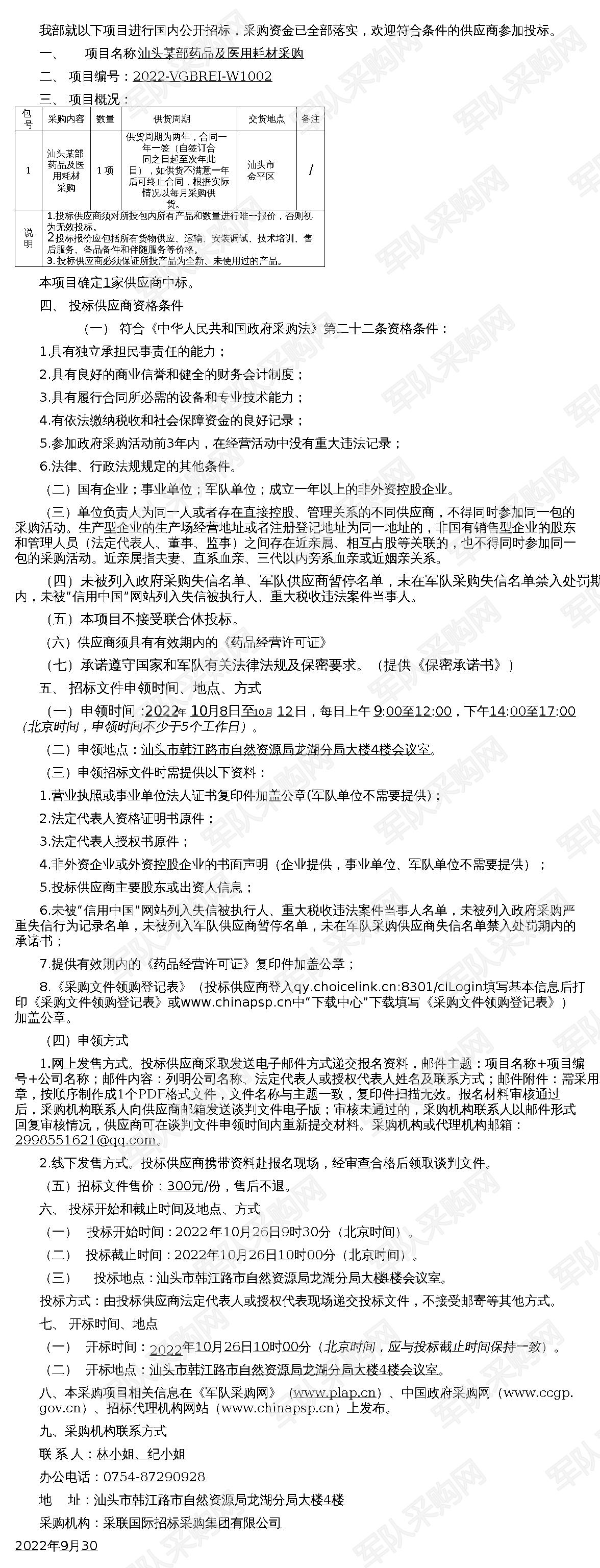 【军队采购网汕头某部】药品及医用耗材采购公告(2022-VGBREI-W1002)