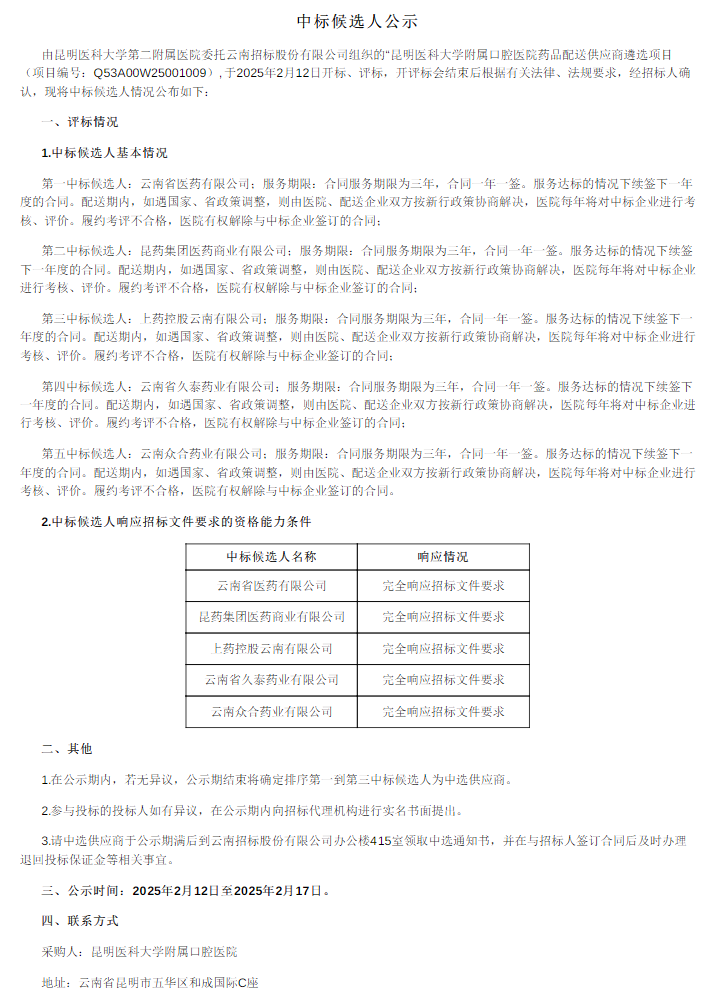 【昆明医科大学附属口腔医院】云南省昆明医科大学附属口腔医院药品配送供应商遴选项目中标候选人公示