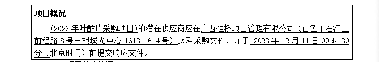 采购需求:采购叶酸片117450板,如需进一步了解详细内容,详见采购文件;