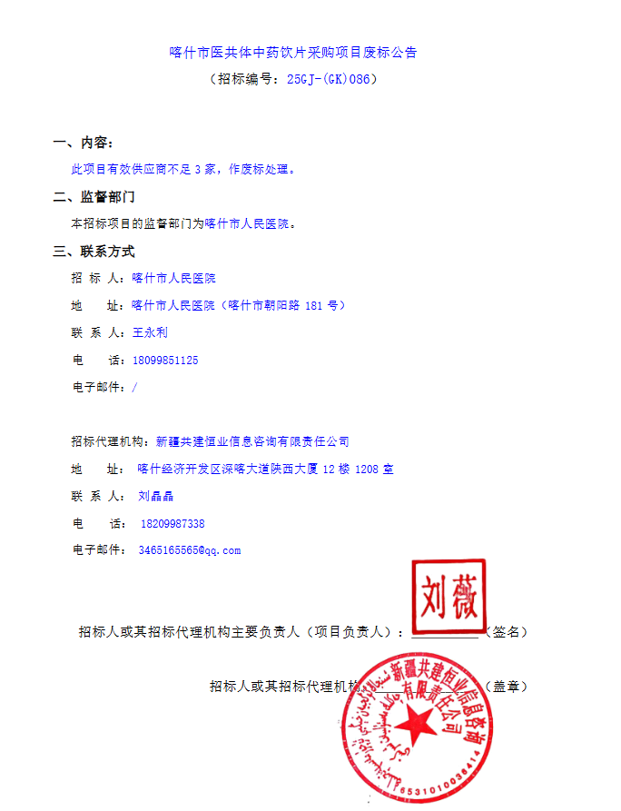 【喀什市人民医院】新疆维吾尔自治区喀什市医共体中药饮片采购项目废标公告