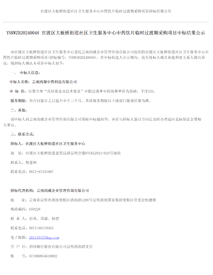 【昆明市官渡区大板桥街道社区卫生服务中心】云南省昆明市官渡区大板桥街道社区卫生服务中心中药饮片临时过渡期采购项目招标结果公告
