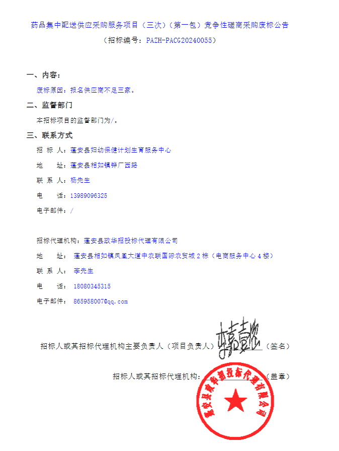 【南充市蓬安县妇幼保健计划生育服务中心】四川省南充市蓬安县妇幼保健计划生育服务中心药品集中配送供应采购服务项目(三次)(第一包)竞争性磋商采购废标公告