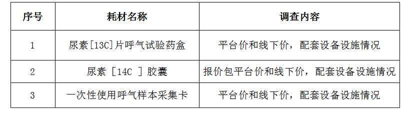 为了增进医院对尿素[13C]片呼气试验药盒、尿素[14C ]胶囊等耗材/药品市场情况的了解,本着“公平、公开、公正”的原则,欢迎符合法律法规规定条件的知名品牌(包括生产厂商和代理商)公司参与本次需求调查,并按要求提交相关资料。