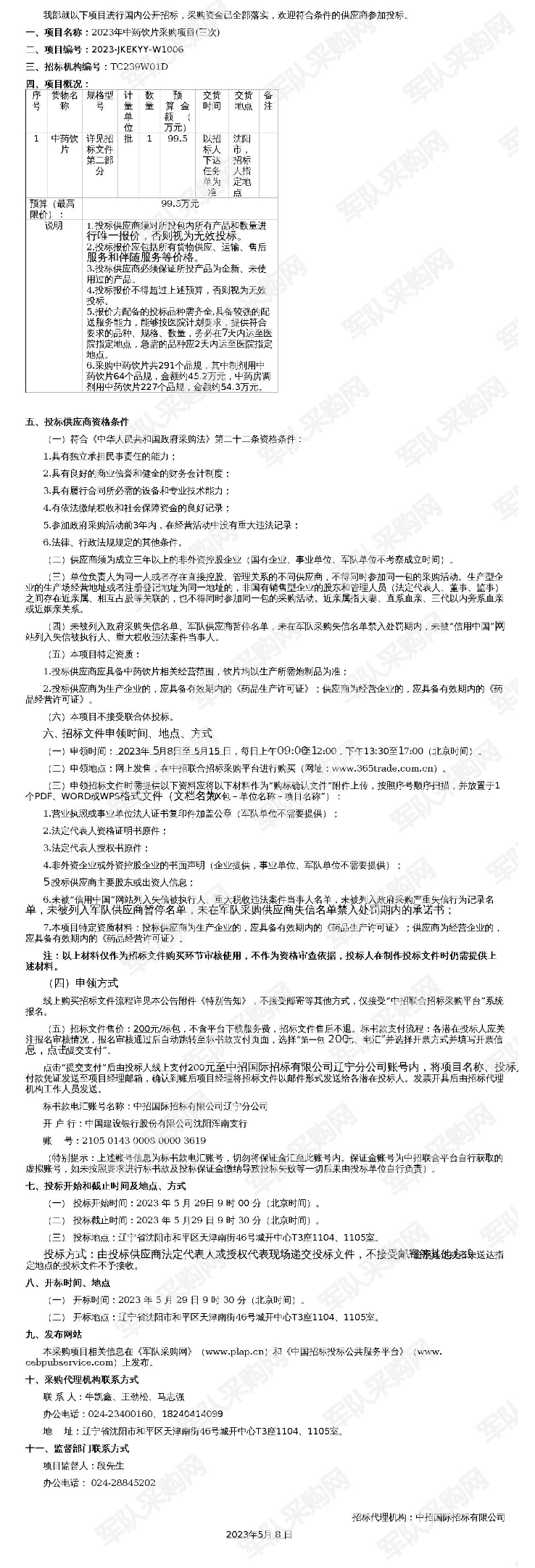 【军队采购】军队采购网2023年中药饮片采购项目(三次)采购公告(2023-JKEKYY-W1006)