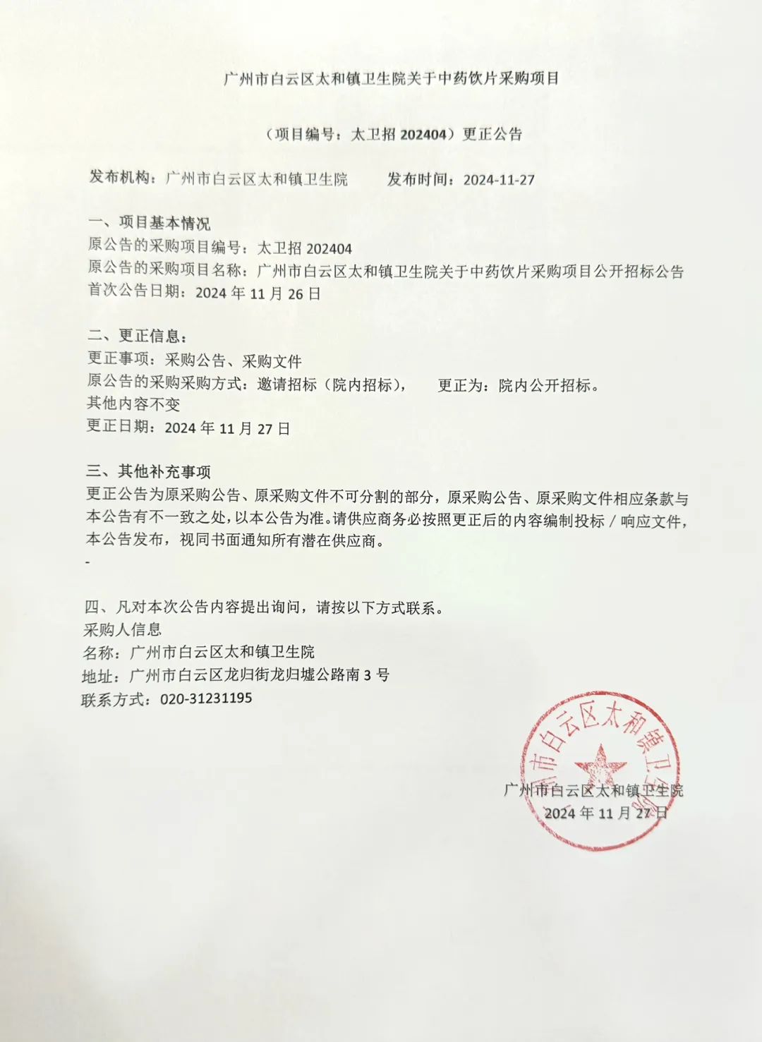 【广州市白云区太和镇卫生院】广东省广州市白云区太和镇卫生院关于中药饮片采购项目更正公告