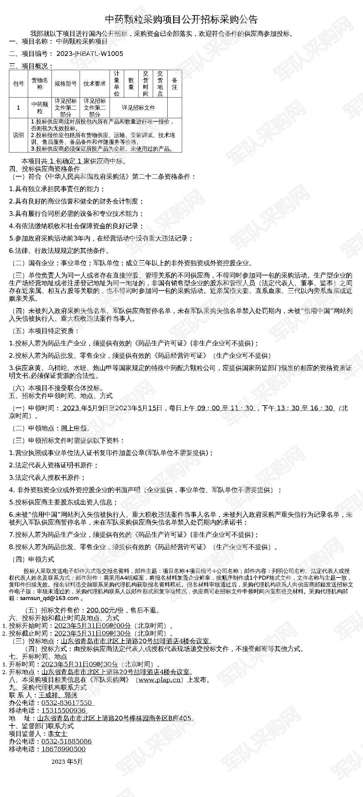 【军队采购】军队采购网中药颗粒采购项目公开招标采购公告(2023-JHBATL-W1005)