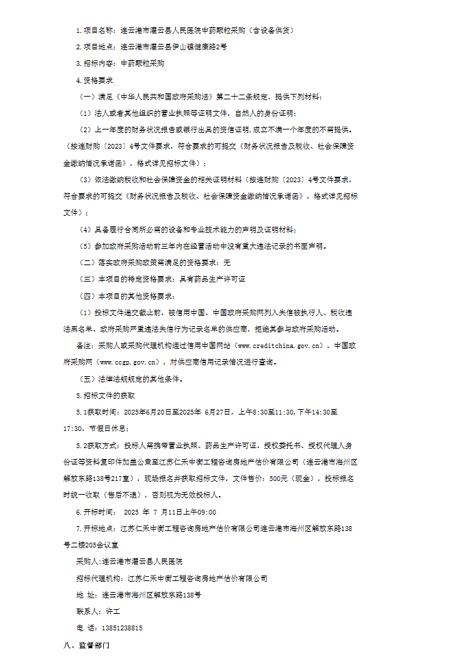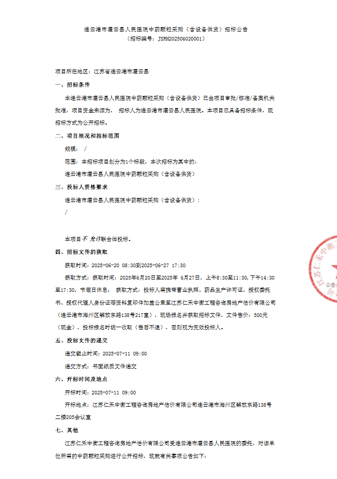 【连云港市灌云县人民医院】江苏省连云港市灌云县人民医院中药颗粒采购(含设备供货)招标公告
