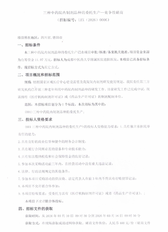 【成都中医药大学附属医院德阳医院】四川省成都中医药大学附属医院德阳医院三种中药院内制剂品种的委托生产--竞争性磋商