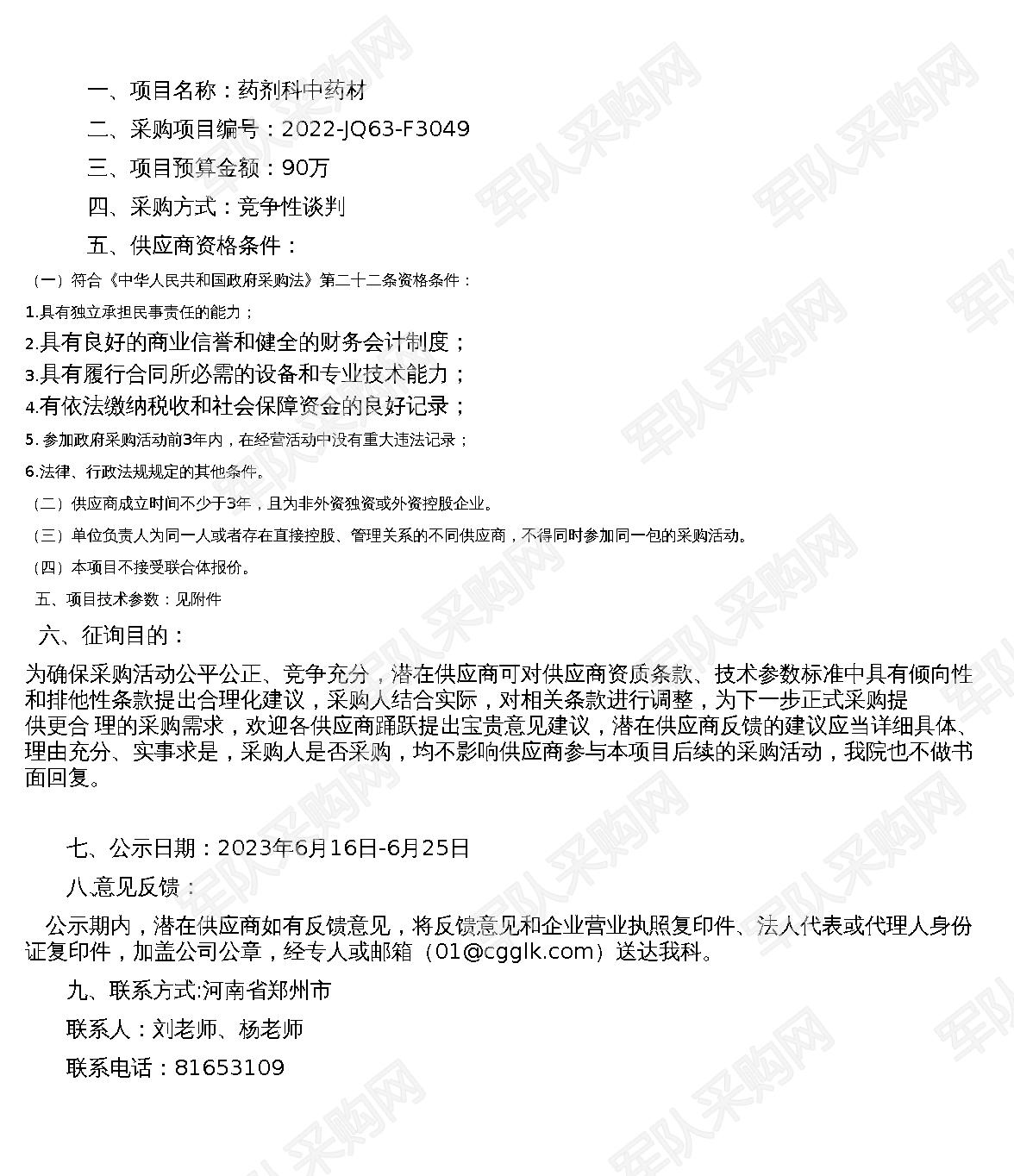 【军队采购】军队采购网药剂科中药材参数公示2022-JQ63-F3049